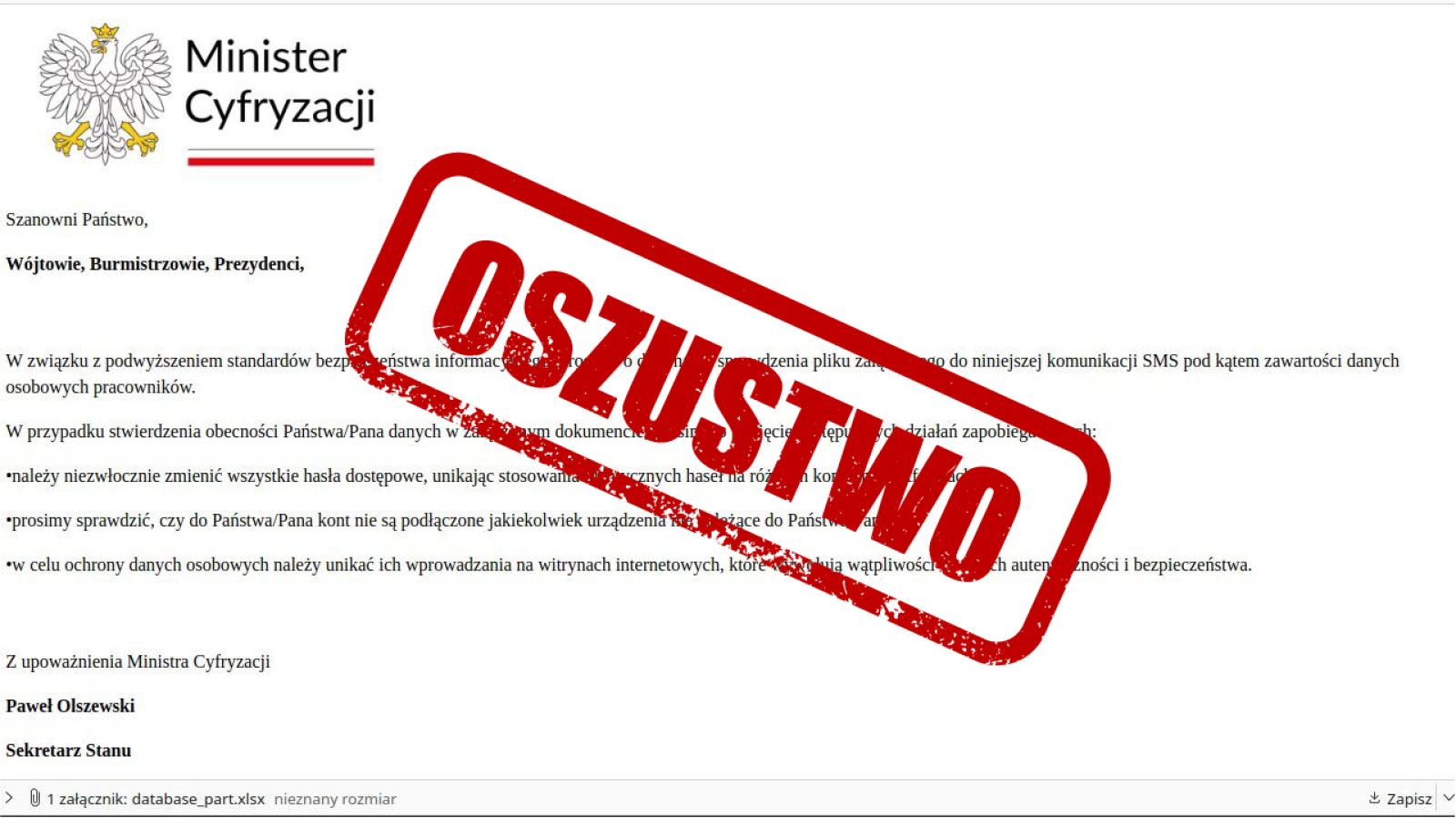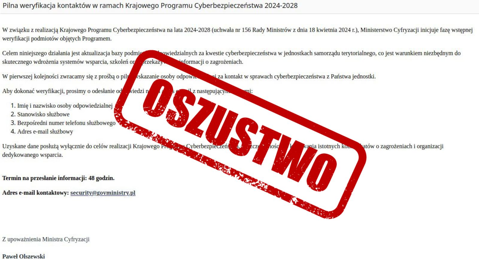 Jednostki samorządu terytorialnego są celem nowej kampanii phishingowej, w której oszuści podszywają się pod Ministerstwo Cyfryzacji i wiceministra Pawła Olszewskiego. Próbują wyłudzić wrażliwe dane lub zainfekować urządzenia złośliwym oprogramowaniem. Przed zagrożeniem ostrzega Pełnomocnik Rządu do spraw Cyberbezpieczeństwa, Krzysztof Gawkowski.